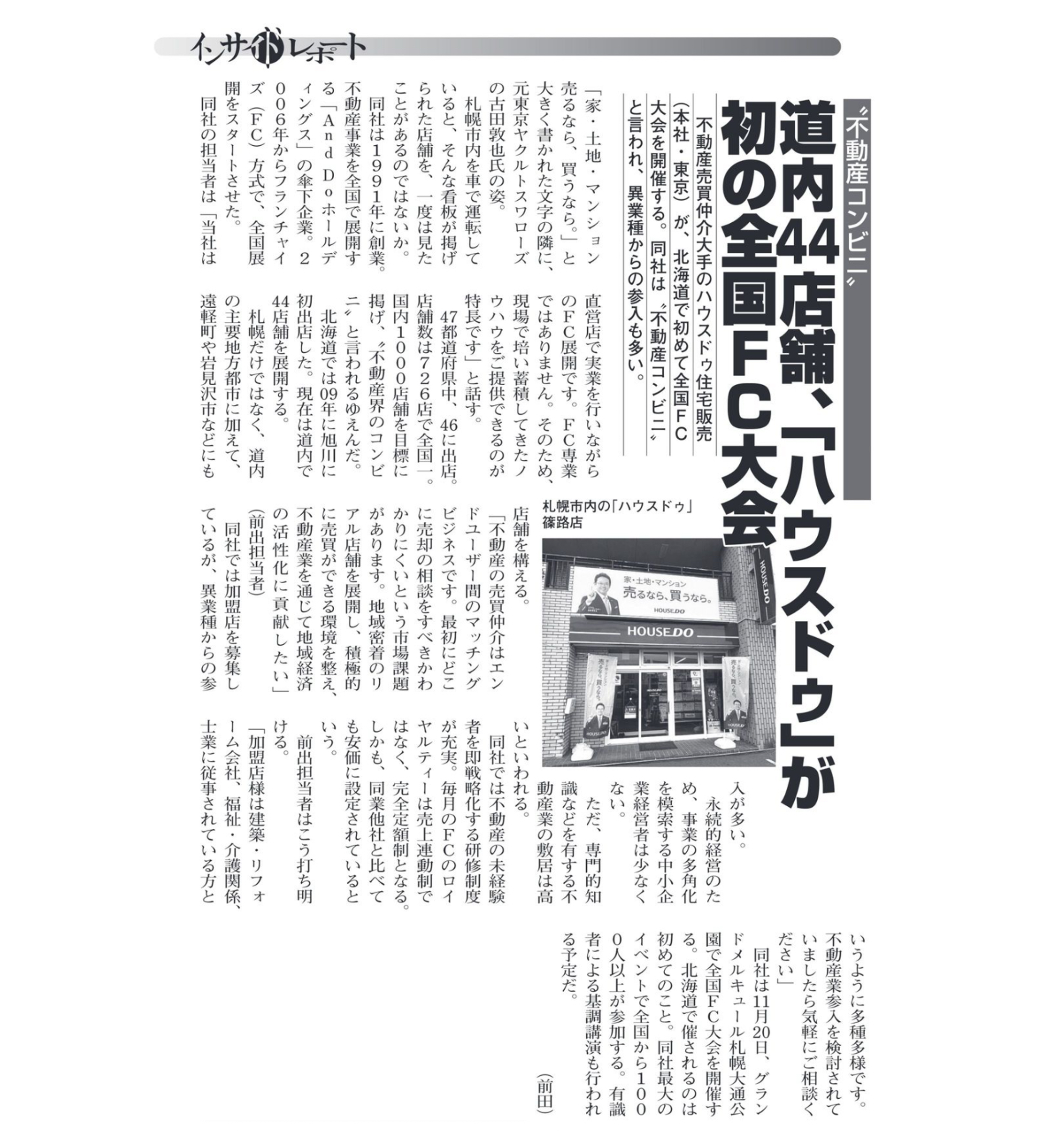 2025年10月15日号【財界さっぽろ】にて、ハウスドゥの記事が取り上げられました。詳しくは、紙面をご確認ください。 【本件のお問い合わせ先】 株式会社ハウスドゥ住宅販売 フランチャイズ事務局 TEL:0120-411-123