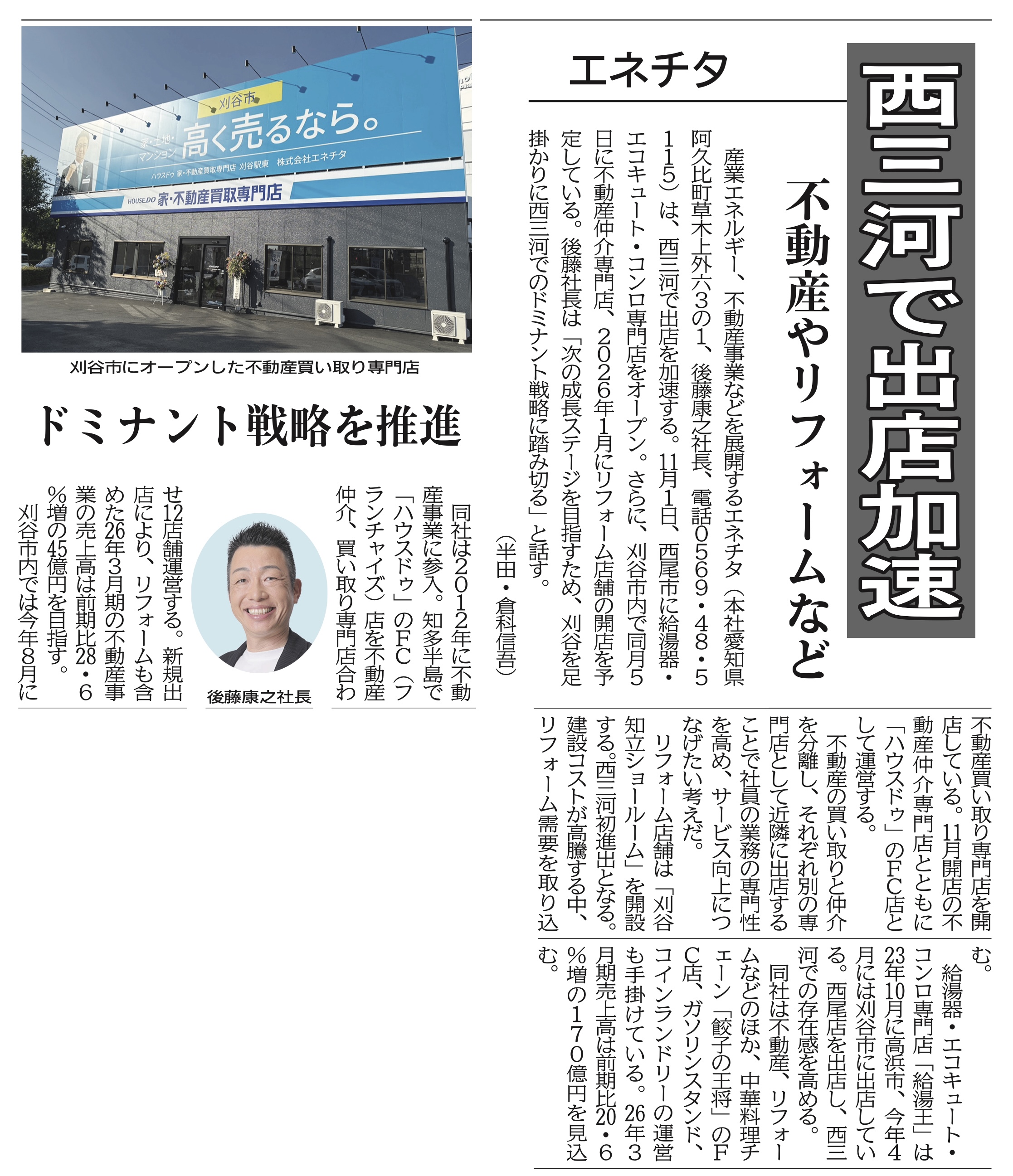 2025年10月17日号【中部経済新聞】にて、ハウスドゥの加盟店様の記事が取り上げられました。詳しくは、紙面をご確認ください。