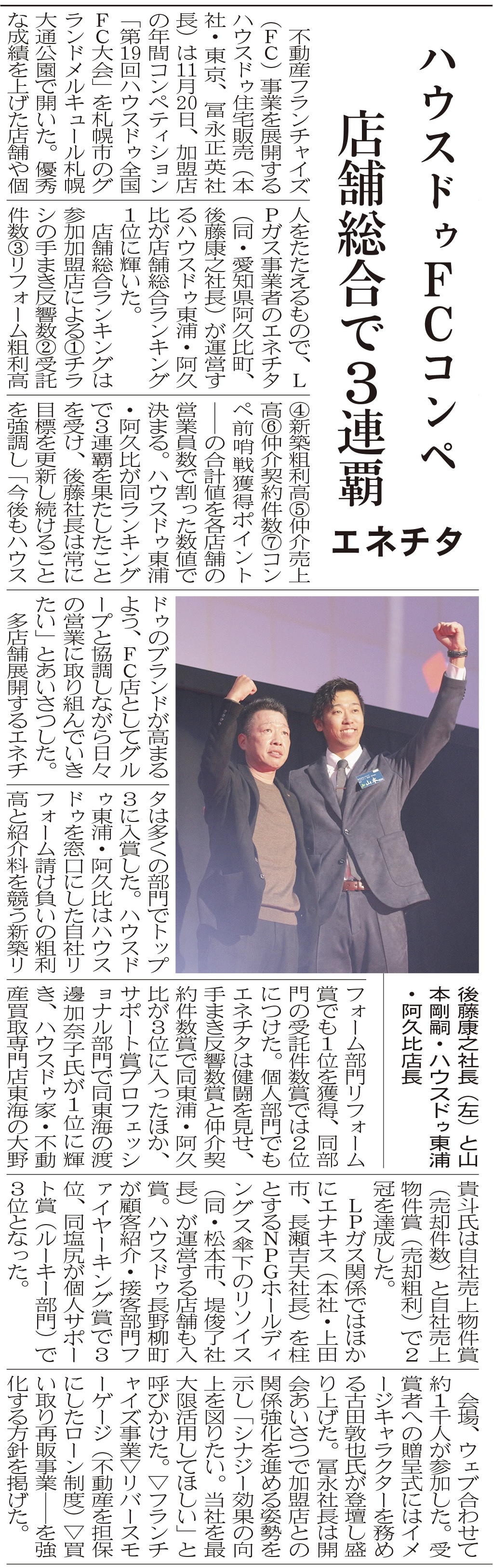 2025年12月15日号【プロパン・ブタンニュース(株式会社石油化学新聞社)】にて、ハウスドゥの記事が取り上げられました。